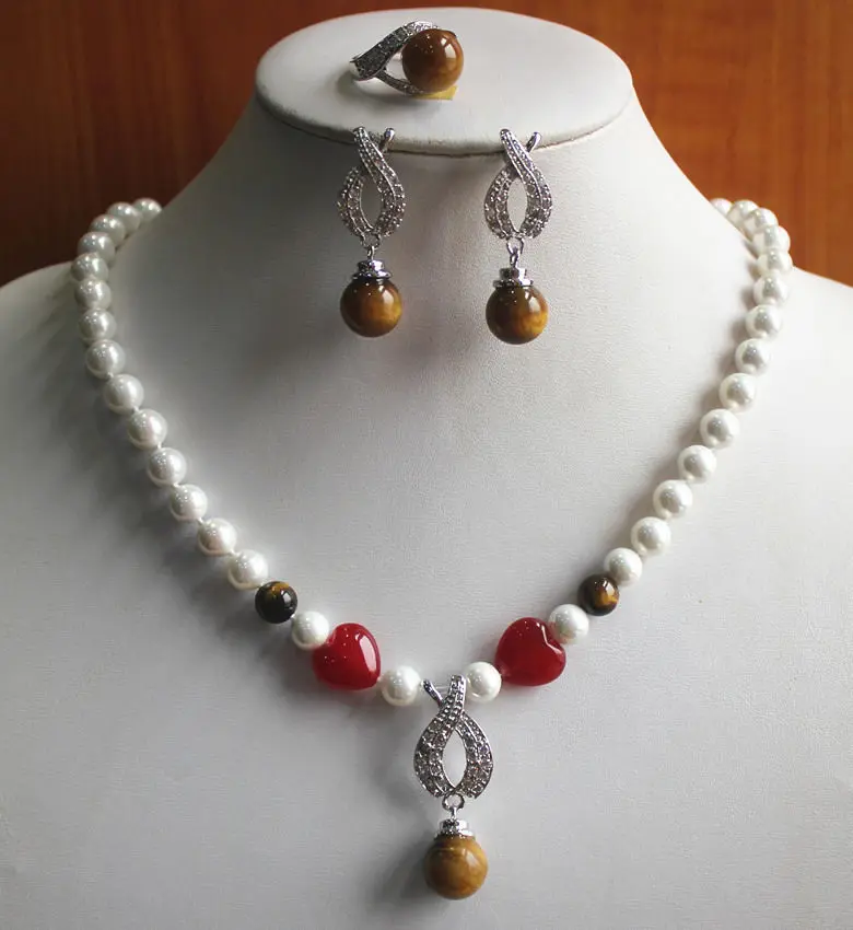 Review Mother's Day Charming White Pearl Mixed Tiger Eye Stone Necklace Earring Ring Jewelry Set gem women