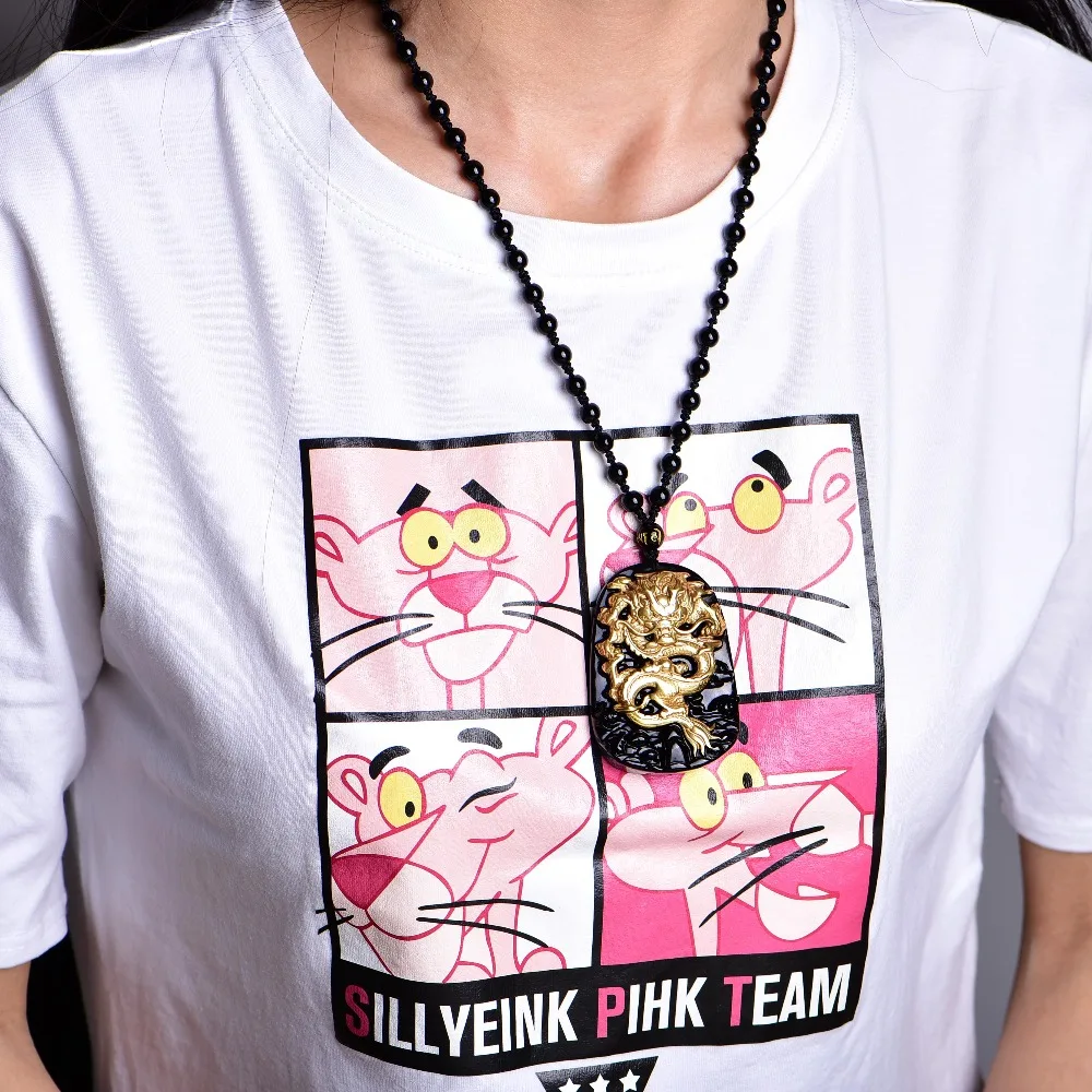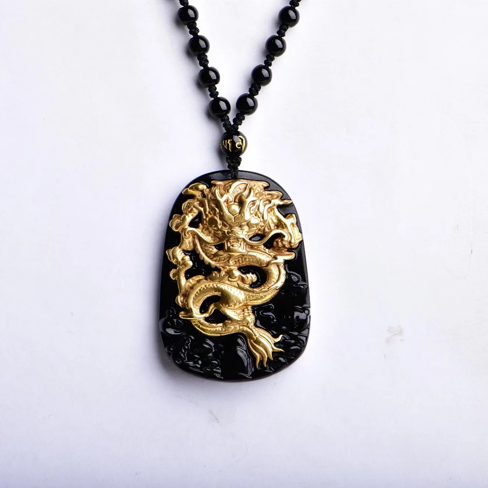 HIGH QUALITY Wholesale Gold Natural Black Obsidian Carving Dragon Lucky Amulet Pendant Necklace For Women Men pe