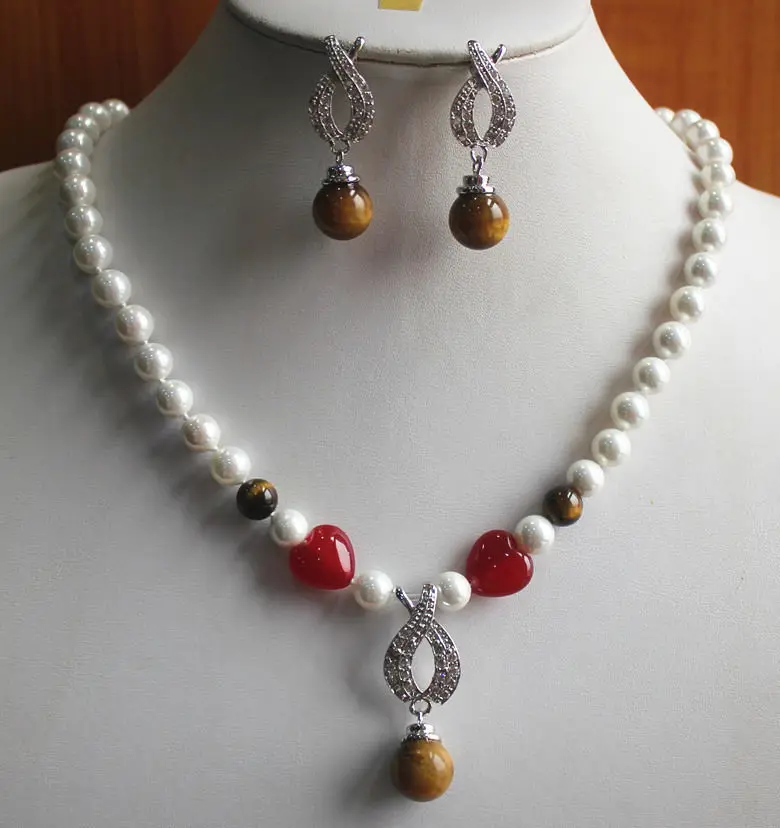Exquisite Fancy Jewelry New women's Chqrming 8mm White Shell Pearl Necklace Tiger Eye Earring Penda