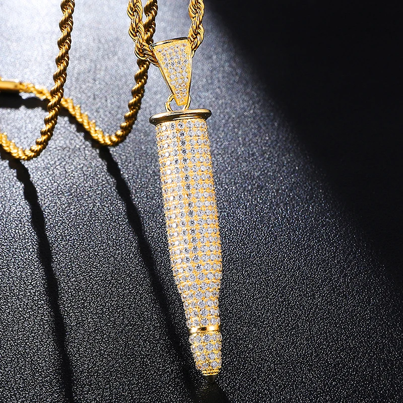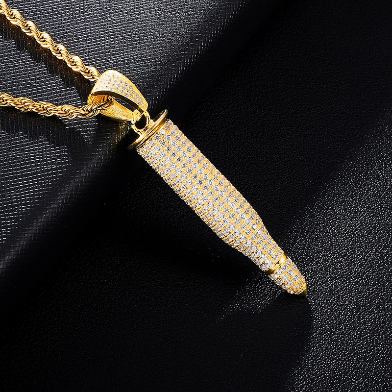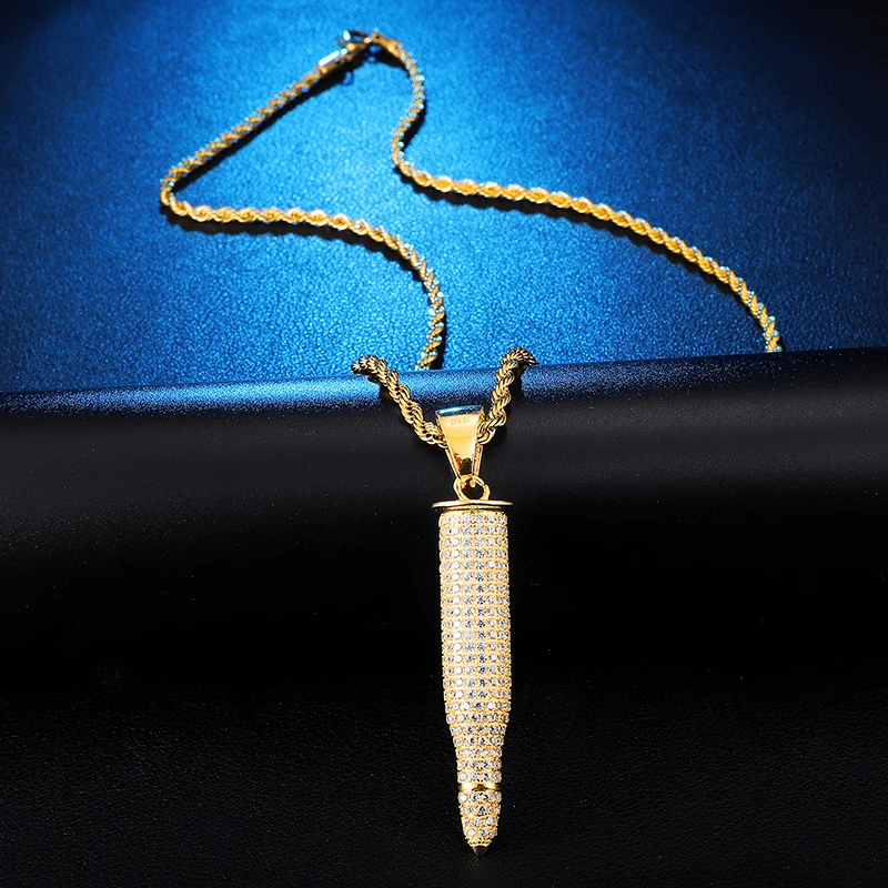 HOT Sale Hip Hop Shiny Crystal Bullet Necklaces Pendants Gold Color Stainless Steel Necklace For Men Jewelry