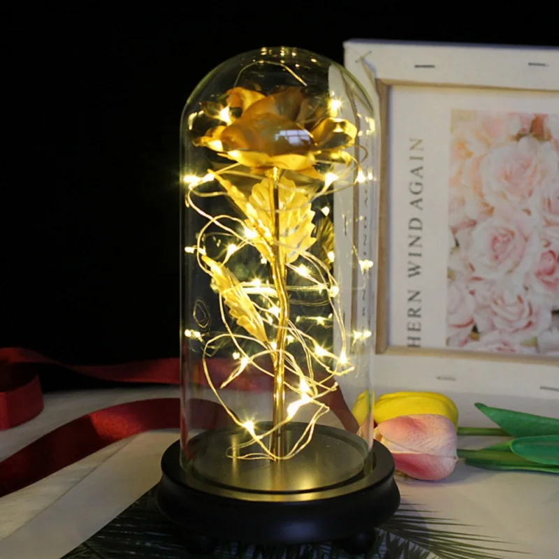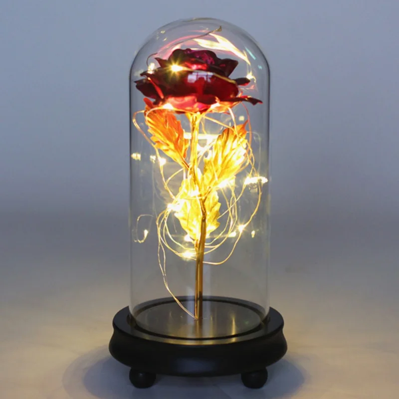 TOP Artificial Gold Leaf Rose Glass Cover Creative Glowing Jewelry Handmade Rose Wooden Base Fashion Va
